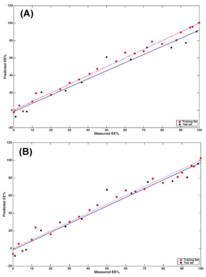 As in the case of MIR data, a second PLS model was built by including only the wavenumbers that were identified as relevant based on their VIP score. The resulting model had an optimal complexity of 6 LVs and led to an RMSECV of 9.7. When applied to the test samples, it resulted in a good predictive ability since the RMSEP was 8.1 and the R2p = 0.94 with biasp = 2.0. These results can be graphically appreciated as shown in Figure 5B, where the predicted vs. observed EE% values are displayed for both training and test samples.