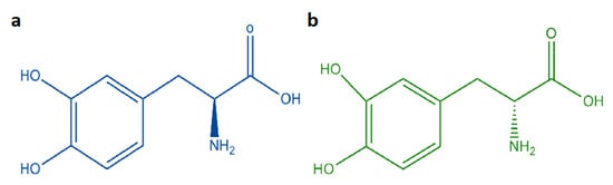 A total of 33 mixtures of racemic and pure L-DOPA were prepared using certified standards purchased at Sigma-Aldrich (St. Louis, MO, USA). The chemical structures of the two compounds are shown in Figure 7. Details about the masses of the two constituents of the mixtures and the consequent percentage of enantiomeric excess are shown in Table 2. All the mass measurements were performed using a Gibertini E50S analytical scale (Novate Milanese, Italy).