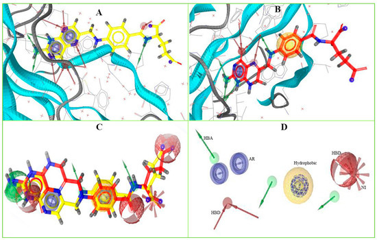 Figure 1. The overall pharmacophore model generated during the study. Herein, (A) pharmacophore features generated from 5VYH (PDB)-Folic Acid (yellow) complex interaction, (B) 6PXH (PDB)-Dihydrofolic Acid (red) complex interaction, (C) merge pharmacophore features, and (D) final pharmacophore features utilized for virtual screening. The hydrogen bond donor (HBD) features have shown in green, hydrogen bond acceptor (HBA) in red, negative ionizable area (NI) in red astricts, aromatic ring (AR) in blue, and hydrophobic (H) features in yellow color.