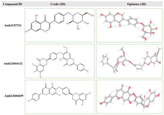 Geometry optimization is a quantum chemical technique used by most computational biologist, chemists, academics, and researchers to find the configuration of minimum energy with the most stable form of a chemical structure. It is a method of taking rough geometric approximations and making them as exact as possible [26]. The geometry with the lowest energy is the most stable because molecules with lowest energy state spontaneously decrease its energy by emitting. Therefore, the best optimized molecular geometry with the lowest energy value has been determined by using the default basis set 6-31G(d,p) in Jaguar. The 2D structures and 3D optimized geometries of the compounds Amb23604659, Amb23604132, and Amb1153724 have been plotted in Figure 5. Additionally, the bond angles, bond lengths (bohr, angstroms), and torsional angles optimized during the process have been provided in Supplementary text file format (renamed as Geometry). The optimized structure has been retrieved for further evaluation through molecular docking simulation.