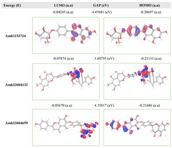 The FMO is now significantly used in organic chemistry to explain the structure and reactivity of molecules. The theory can describe the electronic and optical properties of molecules by utilizing HOMO-LUMO bandgap energy [27]. The energy gap between the two orbitals HOMO and LUMO also helps to determine the sensitivity of atoms toward electrophilic and nucleophilic attacks, chemical kinetic stability, chemical hardness, and softness of a molecule [26]. The electrons localized from the HOMO orbital is most free to participate in the nucleophilic reaction, where the LUMO participates in the electrophilic reaction. A molecule with low HOMO-LUMO gap energy should have a high chemical reactivity and low kinetic stability that can be considered as a soft molecule. In this process, a molecule with a high frontier (HOMO-LUMO) orbital gap should have low chemical reactivity or bioactive and high kinetic stability due to the low probability of adding an electron to the high-energy LUMO. The molecules with a high FMO energy gap are energetically stable related to low chemical reactivity and high kinetic stability compared to a molecule having a low FMO energy gap [27]. Therefore, to evaluate the chemical reactivity and kinetic stability of the selected three compounds the HOMO, LUMO, and HOMO-LUMO, gap energy was calculated from equation (3) and shown in Figure 6, the hardness and softness of the molecules have also been calculated and listed in Table S2. The calculated FMO energy band gap values found for the compounds Amb1153724, Amb23604132, and Amb23604659 was 4.48 eV, 3.60 eV, and 4.35 eV, respectively, which was considerably higher, indicating kinetic stability and low chemical reactivity of the molecules.