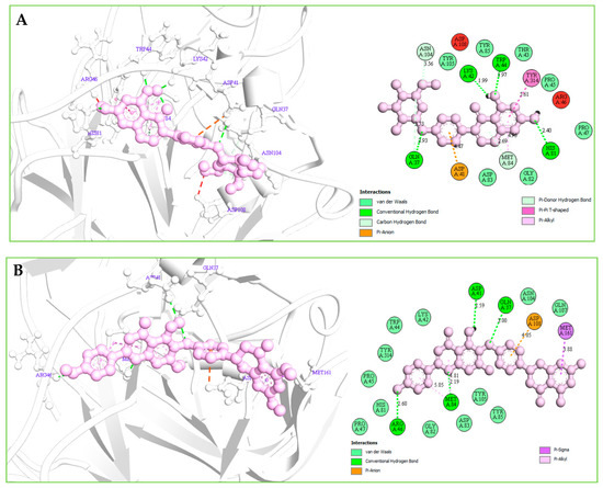 The compounds Amb23604659 have been found to form a total of ten bands including five hydrogen bonds (four conventional H-B and one carbon H-B), one electrostatic (Pi-Anion), and four hydrophobic bonds (one Alkyl, two Pi-Alkyl, one Pi-Pi T-shaped) with the protein in different residual position having a distance between 2.0 Å to 5.10 Å shown in Figure 7B.