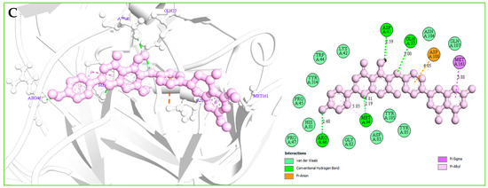 Understanding the potential interactions between a protein–ligand complex is an important part of the field of drug discovery, which helps to identify hits to leads as a potential drug candidate. Interaction analysis also helps to navigate the position of small molecules in a protein and determine the behavior on biological networks. Accurate identification of protein–ligand interactions play a key role in drug development and disease treatment. Therefore, the interaction between the selected three compounds and desire S1-NTD protein has been analyzed by using the BIOVIA Discovery Studio Visualizer tools. Analysis of the complex structure identified different bonding interaction includes hydrogen bond (Conventional H-B, Carbon H-B, and Pi-Donor H-B), electrostatic (Pi-Anion), hydrophobic (Alkyl, Pi-Alkyl, Pi-Pi T-shaped, and Pi-Sigma) between the protein and ligand listed in Table 4 and depicted in Figure 7.