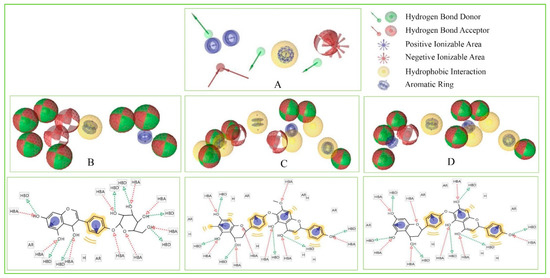 Figure 8. Showing the pharmacophore features of selected three compounds in 3D and 2D format along with the query features that have previously been used to screen the compounds. Herein, the figure representing (A) Query pharmacophore features and features generated from the compounds (B) Amb1153724, (C) Amb23604132, and (D) Amb23604659 during the screening process.