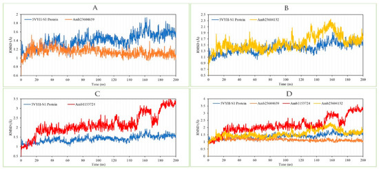 The RMSD of the selected three compounds and the protein has been analyzed to determine the system has equilibrated or not. The RMSD of selected three compounds Amb23604659, Amb23604132, and Amb1153724 complex structure has been compared with the native S1 protein structure to observe the changes of the order shown in Figure 9. The RMSD for all the compounds was in a range between 1.0 Å to 2.5 Å that was perfectly acceptable compared to the structure of the native protein. The highest fluctuations (<3.0 Å) found for the compounds Amb1153724 between 185 ns to 200 ns simulation time and gradually stabilize, however, indicate that the compound has undergone a small conformational change during the simulation. It has been found that the simulation was converged between 20 ns to 160 ns for all the compounds and the RMSD values have been stabilized around a fixed value within the time. The fluctuations for all the selected compounds towards the end of the simulation were around some thermal average structure. Therefore, the selected compounds can be considered as stable to the targeted protein. Additionally, the RMSD for all the selected three ligands was observed to show how stable the ligand was concerning the desired protein and its binding site (Figure S3). The values observed for the ligand were closer than the RMSD of the S1-NTD protein, then it has been considered that the ligand will not be diffused away from its initial binding site.