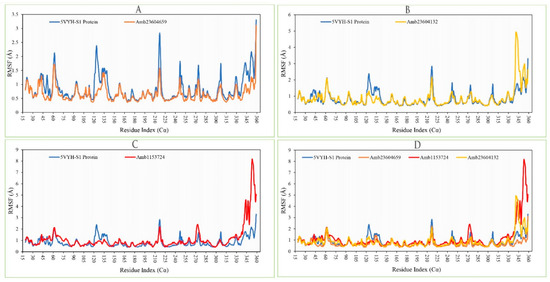 Figure 10. Showing the RMSF values extracted from the Cα atoms of the selected three complex structures. Herein, showing the RMSF of S1-NTD protein (Blue) in complex with the compounds (A) Amb23604659 (orange), (B) Amb23604132 (Yellow), and (C) Amb1153724 (Red), where (D) representing all the compounds and protein RMSF together.