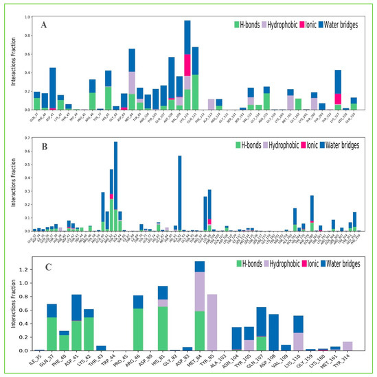 Figure 11. The stacked bar charts showing the protein–ligands interactions found during the 200 ns simulation run. Herein, showing the selected three ligands (A) Amb23604659, (B) Amb23604132, and (C) Amb1153724 contact map with the desire S1-NTD protein.
