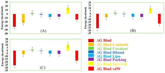 Figure 12. Representing different energy components and net MM/GBSA binding free energy (kcal/mol) with standard deviation values for extracted snapshots of MERS-CoV S1-NTD protein in complex with selected compounds, i.e., (A) Amb1153724, (B) Amb23604132, and (C) Amb23604659 from respective 200 ns MD simulation trajectories.