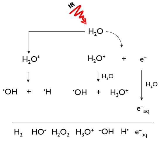 Hydrated electrons (e−aq), and radical and molecular species generated during water hydrolysis.