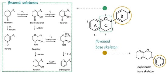 Flavonoid base skeleton and structural modifications of ring C which led to different flavonoid subclasses (green box). Isofavonoids are from the 1,2-aryl shift (yellow circle).