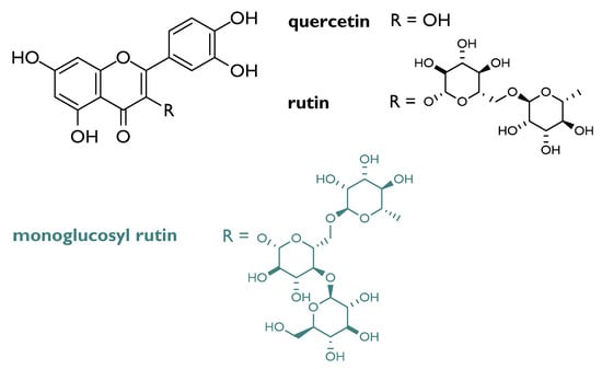 Chemical structures of quercetin, rutin and its monoglucosyl derivative.