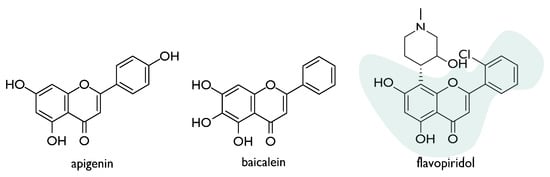 The interest in flavonoids as radiomodulators also led to screen the properties of semisynthetic drugs, such as flavopiridol (Figure 5). This compound, also known as alvocidib, is a flavone derivative that was developed by Sanofi-Aventis, based on a flavonoid derived from the Indian indigenous plant Dysoxylum binectariferum. Flavopiridol, structurally based on flavonoid (2-cholorophenyl-4-one) and an alkaloid (1-methylpiperadine) moieties, is a CDK inhibitor that exhibited potent inhibition of CDK1, 2, 4, 6, 7, and 9. It was observed that the compound acts to inhibit and/or repair sublethal damage as well as the repair of DNA double-strand breakage followed by radiation therapy in malignant tumours. Indeed, it might enhance the cytotoxic effect of radiation in radioresistant tumour cells through p53 dysfunction or Bcl-2 overexpression [58].