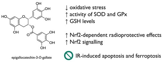 Epigallocatechin-3-O-gallate (Figure 6), the main polyphenol in green tea, due to its antioxidant activity and the efficacy in ameliorating many oxidative stress-related diseases, is of wide interest. It promoted Nrf2-dependent radioprotective effects and Nrf2 signalling, in turn, and was found to repress IR-induced apoptosis and ferroptosis, ameliorating intestinal injury induced by total body irradiation in male C57 BL/6 J mice [49]. The radioprotection of EGCG was studied through a model of oxidative damage in 60Coγ radiation mice, and data acquired evidenced the ability of the compound to enhance the activity of enzymatic antioxidants, such as superoxide dismutase and glutathione peroxidase, as well as glutathione levels [50].
