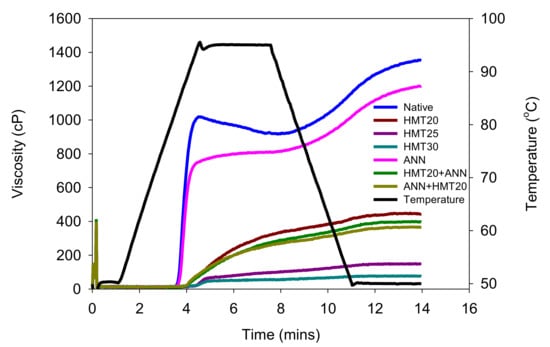 The viscosity profiles during the pasting of water caltrop starch are shown in Figure 2. It was found that the hydrothermal treatments applied in this study may exert molecular changes of water caltrop starch, and modify the rheological properties, including the onset of gelatinization, the peak viscosity, the shear resistance, and the final viscosity of starch pastes. The overall viscosity was decreased significantly by hydrothermal modification (p < 0.05) because of the rearrangement of the starch structure that enfeebled the gelatinization and limited the swelling of starch granules. However, it also implied that hydrothermal modification could reduce the effect of shearing force under high temperatures [24,25]. In addition, the pronounced decrement of setback viscosity (p < 0.05) indicated that modified starch showed less tendency to retrograde [26]. Moreover, HMT exhibited a more pronounced influence than ANN (p < 0.05), and the viscosity decreased gradually with the increased moisture level during HMT (p < 0.05), which was possibly due to the shorter chain length of amylopectin and lower swelling power in HMT samples [20].
