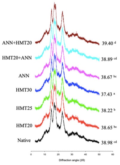 As shown in Table 3, HMT and dual modification slightly increased the amylose content of water caltrop starch. It may be due to the weaker steric hindrance near the α-1, 6 than α-1, 4 glycosidic bond caused by HMT which effectively broke down the α-1, 6 glycosidic bond, destroyed the side chain of amylopectin, and produced the short-chain amylose [41,42]. However, there was no significant difference between HMTs with different moisture contents (p > 0.05). ANN had no significant difference compared to native starch, and the trend was consistent with the results of wheat, corn, and potato starch modified by ANN [43].