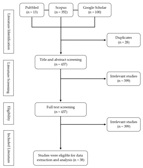 The PRISMA flow diagram of the publication screening is presented in Figure 1. Initially, 465 publications were identified through the systematic literature search string described in Table 1. Following the relevance of the initial papers to the defined research questions for this study, the literature screening, which consisted of title, abstract, and full-text screenings, resulted in 38 final papers for further data extraction. Overall, the screening processes only included 10% of the initially identified papers in Scopus, PubMed, and Google Scholar publication databases. The literature search results from major scholar databases such as Scopus as well as Google Scholar suggested the approximate publications that were recorded out of publications with duplicates (Figure 1). The cut-off date of the literature search was 13 February 2021.