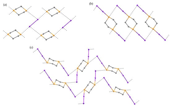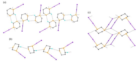 Through variations in solvent and stoichiometry, three new structures resulting from the reaction of I2 and 1,4-dithiane were obtained. The first, (1,4-dithiane)(I2) (4), is a 1:1 cocrystal obtained when the reaction is conducted in perfluoropyridine, and it possesses a significantly longer S···I distance than any of the other products observed in this study (Figure 4a and Supplementary Figure S13), such that the S···I interactions in 4 distinguish themselves from the more covalently bonded adducts of the other structures (1–3, 5, 6). Each iodine atom is involved in both a strong halogen bond (dS···I = 3.0813(7) Å, R = 0.78) and much weaker chalcogen bond (dS···I = 3.8728(7) Å, R = 0.99). The two types of interactions can be easily distinguished by the orientation of the interaction relative to the I-I bond. For the halogen bond, the S···I-I angle of 179.074(12)° indicates involvement of the σ hole on the iodine atom [27,28,29]. The chalcogen bond shows a distinctly different orientation, with an S···I-I angle of 77.077(14)°, as well as a C-S···I angle of 177.17(8)°. These two angles taken together demonstrate an interaction between the band of increased electrostatic potential on the iodine atom, located normal to the I-I bond, as well as the σ hole of the sulfur atom, located along the elongation of the C-S bond.