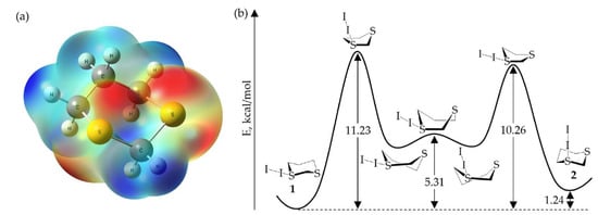 Electrostatic potential (ESP) map of 1,3-dithiane (a) and reaction coordinate of the ring flip from 1 to 2 (b). The electrostatic potential is calculated at the 0.005 au isodensity surface and ranges from −25 kcal/mol (red) to 38 kcal/mol (blue).