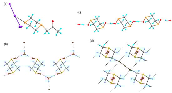 Throughout this investigation, several other interesting products that involve the formation of new covalent bonds to sulfur were obtained by the reaction of 1,4-dithiane with both I2 and Br2. If the 2:1 I2:1,4-dithiane reaction is conducted in acetone, a sulfonium cation is formed from the addition of acetone to one of the sulfur atoms of the dithiane ring (7) (Figure 5a and Figure S16). A triiodide anion is also present to balance the charge. A chalcogen bond is present between the disubstituted sulfur atom and the central atom of the triiodide anion (dS···I = 3.8586(7) Å, R = 0.98, θC-S···I = 177.55(10)°). The bromide salt of this compound has been prepared previously by the reaction of bromoacetone and 1,4-dithiane in ethanol [31].