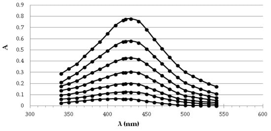 The exemplary spectra recorded for different dilutions of the chlorogenic acid standard are presented in Figure 1. Under the influence of the increasing concentration of the reference antioxidant, the enlargement of the embryos takes place, which is reflected in the systematic increase in absorbance. The calibration curves were made for each standard by measuring the absorbance of the dilution series at 423 nm. The obtained curves were subjected to regression analysis (Table 5). The method gave an excellent linear response over a wide concentration range of standards (R2 > 0.9). The limits of detection (LODs) for standards in the SNPAC assay were from 1.51 to 5.85 µM.