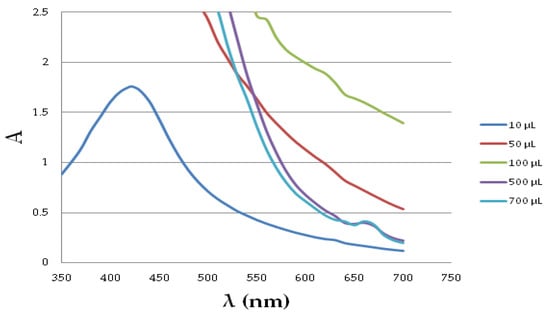 The increase in the volume of the extract caused an increase in the intensity of the SPR band, but in such conditions, an additional band appeared shifted towards longer wavelengths. The reasons for this may be different, but they are usually not favorable. Generally, absorbance at long wavelengths is enhanced due to developing shape anisotropy, the aggregation of small spherical NPs, or an increase in particle size [,,].