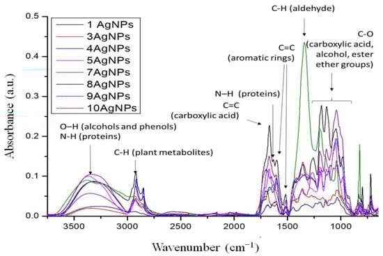 The FTIR spectra of the AgNPs were recorded to identify the functional groups involved in the synthesis of AgNPs (Figure 4). The spectra, apart from the synthesized AgNPs, also contained the plant extract components. Unfortunately, two samples based on extracts from 2-Urtica Dioica and 6-Capsicum baccatum were not measured due to the impossibility of freeze-drying of these samples. The overall observation from the FTIR bands (Figure 3) confirmed that the bioactive component is in charge of the reduction of silver ions to AgNPs. The band at 3304–3340 cm−1 is assigned to the stretching vibration of the OH group, while the band at 2923 cm−1 indicates C-H stretching. The most promising bands that can be responsible for the reduction and stabilization of formed AgNPs are the bands connected with the vibration of functional groups, such as alcohols, phenols, carboxylic acids, etc. The band around 1620 cm−1 is due to the amide C=O stretch. The band with a maximum between 1350 and 1400 cm−1 can be assigned for the alkane -C-H- bond. The band at 1000–1050 cm−1 represents the C-O stretching of carboxylic acids, alcohols, esters, and ether groups [].