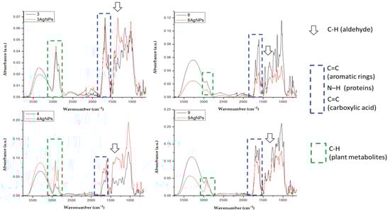 Additionally, the comparative spectra of pure extracts and extracts with synthesized AgNPs were obtained for chosen samples: 3-Salvia officinalis, 4-Tilia cordata, 8-Camellia sinensis, and 9-Ilex paraguariensis. The bands that are most significant/intense for taking part in the synthesis and stabilization of AgNPs are presented in Figure 5. These bands are connected with C-H from aldehyde (1338 cm−1), bands C=C from aromatic rings and/or carboxylic acids, N-H from proteins (1730–1560 cm−1), and C-H from plant metabolites (2980–2770 cm−1). These results are in agreement with the investigation of Balaji Venkatesan et al. [] who reduced silver ions in the presence of extracts from Rosa damascene. Manikandan et al. [], who reduced Ag ions by R. indica extract, indicated that the band at 1624 cm−1 shifted to a higher wavelength, confirming the formation of AgNPs.