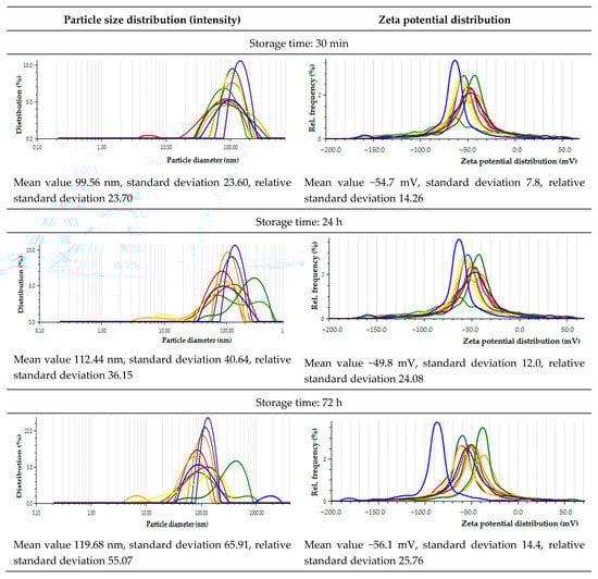 Analyzing the effect of the storage time on the size and zeta potential of extract-mediated nanoparticles, the following trends could be observed (Figure 7): as time passes from 30 min to 72 h, the mean value of the hydrodynamic diameter underwent elevation from 99.56 to 119.68 nm. The coefficient of variance of the AgNPs, being the ratio of SD (standard deviation) to average hydrodynamic diameter, was in the range of 0.23–0.55. The largest nanoparticles were further enlarged; for example, Tilia cordata extract-mediated NPs increased their size from 88.41 to 2946 nm. In turn, the smallest ones reduced their size with time, such as Camellia sinensis extract-mediated NPs for which the beginning size of 62.51 nm depressed to 53.55 nm at 72 h after synthesis. This process can be compared to the maturation of crystalline sediments when their size is normalized as a result of dissolving small and growing large forms. It is significant that the smallest nanoparticles were obtained for the green tea extract, for which the measured antioxidant potential was one of the highest. Moreover, it can be seen that at the beginning, the population of nanoparticles is more homogeneous, while after 72 h, it diversifies. The zeta potential oscillated around −53.5 mV (−54.7; −49.8; −56.1 mM), indicating the sorption of the charged extract components, which stabilize the NPs and counteract aggregation. It should be emphasized that the NPs that were synthesized with Capsicum baccatum extract showed the most negative zeta potential. In this case, the zeta potential becomes increasingly negative over time, decreasing from −66.0 mV to −88.6 mM. Recent studies concerning the biosynthesis of AgNPs with Capsicum extract indicated that the proteins which have amine groups are responsible for the reduction during the formation of silver nanoparticles. It was proven that the secondary structure of the proteins is able to change after reaction with silver ions [,].