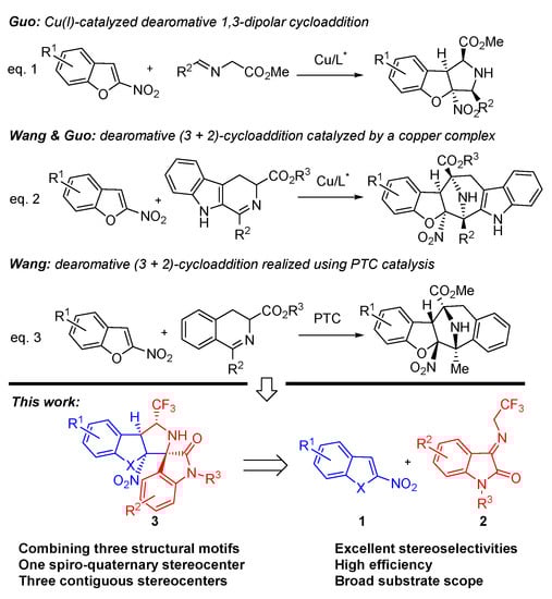 CADA reactions involving electron-deficient nitro(hetero)arenes, such as 2- or 3-nitroindoles [29,30,31,32,33,34,35,36,37,38], 2-nitrobenzofurans [37,39,40,41,42,43,44], and 2- or 3-nitrobenzothiophenes [39,40,43,45,46], have recently provided a direct route to highly substituted polycyclic compounds with multiple stereogenic centers. Due to the immense biological importance of benzo-fused units, the development of new approaches for the synthesis of these compounds is highly desirable. In this context, enantioselective dearomative annulations involving nitro(hetero)arenes leading to nitrogen-containing heterocyclic compounds are in great demand. However, to the best of our knowledge, few literature reports describing the asymmetric dearomative (3+2)-cycloaddition of 2-nitrobenzofurans with azomethine ylides are available (Scheme 1). In 2019, Wang, Guo, and co-workers discovered the Cu(I)-catalyzed dearomative 1,3-dipolar cycloaddition for the construction of chiral tricyclic hydrobenzofurans for the first time (Scheme 1, eq. 1) [47]. Later, the same group developed a method for the preparation of chiral tropane derivatives via copper-catalyzed dearomative (3+2)-cycloaddition of 2-nitrobenzofurans and cyclic azomethine ylides (Scheme 1, eq. 2) [48]. Very recently, Wang et al. reported the dearomative cycloaddition for the stereoselective preparation of polycyclic benzofused tropane derivatives by employing bifunctional phosphonium salts as phase-transfer catalysts (Scheme 1, eq. 3) [49].