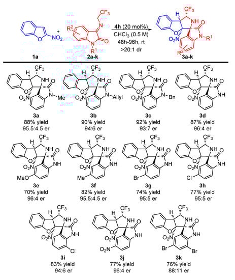 Optimization studies were performed using 2-nitrobenzofuran 1a and N-2,2,2-trifluoroethyl-substituted isatin imine 2a as model reactants. Initially, quinine 4a was employed as a catalyst and the reaction was run in CDCl3 for the ease of data processing (Table 1, entry 1). Pleasingly, the formation of desired 1,3-dipolar cycloadduct 3a was observed; however, low yield and diastereoselectivity were observed. Furthermore, chiral UPC2 analysis of isolated product 3a showed that the reaction proceeded without induction of asymmetry. Therefore, various Brønsted base-type catalysts were evaluated to improve effectiveness and stereoselectivity of the process. Interestingly, the use of commercially available dimeric catalysts 4b or 4c provided a significant increase in conversion and diastereoselectivity (Table 1, entries 2–3). Moreover, when catalyst 4c was used, 3a was obtained with satisfactory enantioselectivity (Table 1, entry 3). Subsequently, the influence of bifunctional catalysts 4d–h on the studied transformation was examined (Table 1, entries 4–8). Performed experiments revealed that squaramide-based catalysts 4e–h derived from quinine were appropriate for the developed cycloaddition (Table 1, entries 5–8). Finally, catalyst 4h was selected for further studies, as its utilization ensured the formation of 3a with good yield and excellent diastereo- and enantioselectivity (Table 1, entry 8). Subsequently, screening of solvents was initiated (Table 1, entries 9–15). Unfortunately, the decrease in reactivity caused by poor substrate solubility or diminished imine 2a stability was observed. Decrease in concentration of the reaction mixture did not bring improvement in terms of yield or stereoselectivity of the transformation, but a longer reaction time was required (Table 1, entry 16). However, imine 2a degradation was observed as the consequence of prolonged reaction time. This problem was eventually solved by the use of 1.5-fold excess of 2a. This change resulted in almost full conversion of 2-nitrobenzofurane 1a, and 3a was obtained with excellent yield and stereoselectivity (Table 1, entry 17). In the hope of improving enantioselectivity, the reaction was performed at lower temperature but, disappointingly, without any enhancement of cycloadduct 3a enantiomeric ratio (Table 1, entry 18). Moreover, 20 mol% loading of the catalyst turned out to be crucial for completion of the reaction, as its lowering led to an inhibition of the process (Table 1, entry 19). Finally, it was found that the reaction proceeded with comparable results in freshly distilled chloroform (Table 1, entry 20). It is worth noting that the presented reaction was readily scalable to one-mmol scale, affording product 3a with a good outcome (Table 1, entry 21).