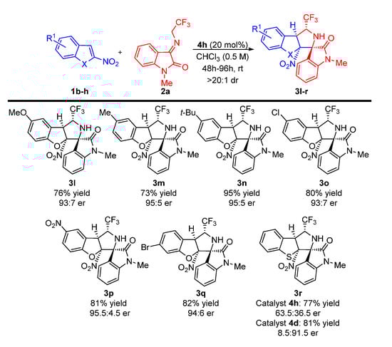 In the next step, the scope of dipolarophiles 1 was examined (Scheme 3). 2-Nitrobenzofuranes 1b–f substituted in the 5-position with groups of different electron properties reacted smoothly in the developed cycloaddition, providing products 3l–p in high yields and with excellent stereoselection. Notably, the bulky tert-butyl group in 1d and the strongly electron-withdrawing nitro substituent in 1f were well tolerated, as demonstrated in the synthesis of 3n and 3p, where the desired reaction proceeded without any loss in enantioselectivity. Notably, cycloadduct 3q with the benzofuran ring functionalized in the 6-position was efficiently obtained following the developed method. Moreover, the substrate scope was further expanded by the use of 2-nitrobenzothiophene 1h. Surprisingly, the developed cycloaddition provided 3r in high yield but with poor enantiocontrol under standard conditions. Thankfully, short re-optimization studies revealed that thiourea catalyst 4d significantly enhanced the stereocontrol affording 3r with good enantioselectivity.