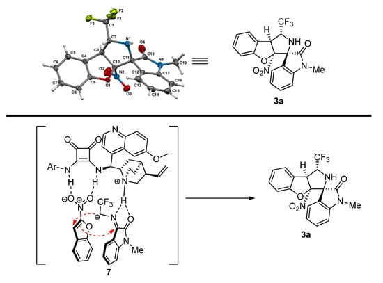 The absolute configuration of product 3a was assigned by X-ray analysis (Scheme 5, top) [57]. The stereochemistry of products 3b–r was determined by analogy. The absolute stereochemistry allowed us to propose a plausible stereochemical model of the cycloaddition (Scheme 5, bottom). The reaction is initiated by two independent processes. The substrate 1 is activated and oriented by the hydrogen bonds of squaramide moiety of the catalyst 4h. Simultaneously, the quinuclidine moiety of the alkaloid catalyst deprotonates the N-2,2,2-trifluoroethyl-substituted isatin imine 2, leading to the formation of azomethine ylide 7. According to the proposed dual-activation model (3+2)-cycloaddition between 1 and 7 takes place providing 3 in a stereoselective manner.