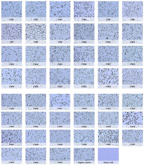 Representative images of cell survival assay results for HeLa cells treated with C. porosus conditioned media. HeLa cells were treated with 100 µL conditioned media from C. porosus for 24 h at 37 °C in carbon dioxide. Positive control cells were treated with Triton X-100. The cells were trypsinized and seeded into a new plate. Microscopic images were taken after 24 h using an inverted light microscope at ×40 magnification. [(CM1: D. grandis, CM2: O. intermedium, CM3: P. aeruginosa, CM4: B. sediminis, CM5: M. paraoxydans, CM6: E. tarda, CM7: A. hermannii, CM8: T. spumae, CM9: D. polyhydroxybutyrativorans, CM10: S. pasteuri, CM11: E. cloacae, CM12: C. yeoncheonense, CM13: B. aryabhattai, CM14: S. aureus) from mouth and esophagus, (CM15: P. hauseri, CM16: H. paralvei, CM17: S. pasteuri, CM18: A. salmonicida, CM19: P. aeruginosa) from stomach, (CM20: K. quasipneumoniae, CM21: S. pasteuri, CM22: K. pneumoniae, CM23: P. guezennei, CM24: O. oryzae, CM25: E. cloacae) from duodenum, (CM26: P. vulgaris, CM27: P. aeruginosa, CM28: P. vulgaris, CM29: P. hauseri, CM30: P. alcalifaciens, CM31: P. rettgeri) from small intestine, (CM32: P. mirabilis, CM33: P. hauseri, CM34: P. alcalifaciens, CM35: P. shigelloides, CM36: A. dhakensis, CM37: P. aeruginosa, CM38: P. vulgaris) from large intestine, and (CM39: P. columbae, CM40: P. terrae, CM42: A. dhakensis, CM43: P. rettgeri, CM44: P. mirabilis, CM45: P. mirabilis) from anus.