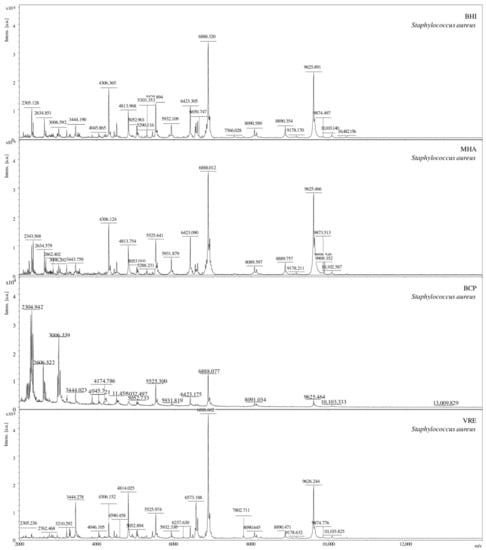 Comparison of the MS spectra for S. aureus bacteria isolated on four different culture media (BHI, BCP, MH, and VRE), [a.u.] = arbitrary units.