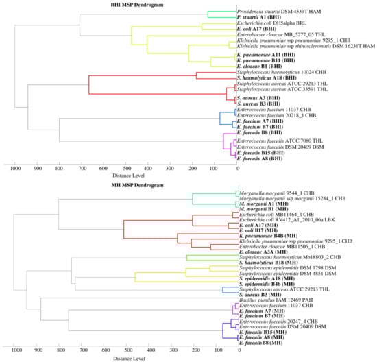 Phyloproteomic relationships between isolates are presented in MSP dendrograms (Figure 2). All the phyloproteomic trees proved the relationship between the bacterial strains isolated from the biological material and the reference strains present in the database. Proteomic trees were made in order to confirm the correct identification of the isolated bacterial strain. Their analysis showed that five groups of bacteria were identified on the BHI medium, four groups on the BCP, five groups on the VRE, and eight groups on the MH. On each of the dendrograms of bacteria evolved from the BHI, BCP, and MH media, bacteria of the genus Escherichia, Klebsiella, and Enterobacter were grouped into one cluster may prove their close relationship.