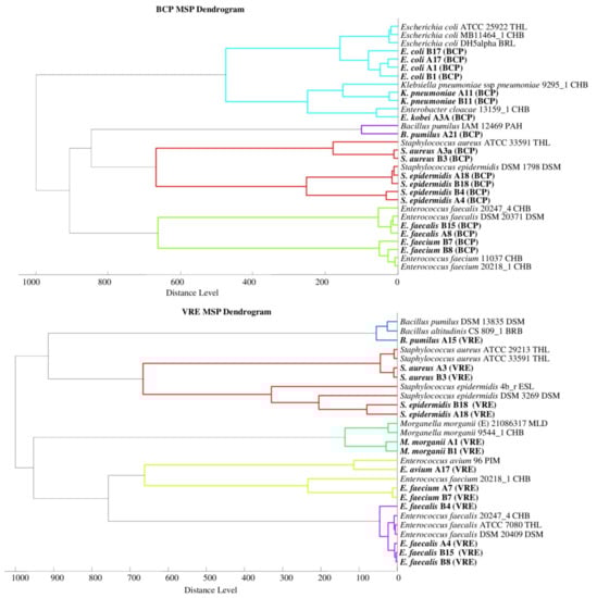 The analysis of the phylogenetic trees by Złoch et al. confirmed the relative origin of the Staphylococcus species [2]. The analysis of the VRE dendrogram shows that Enterococcus bacteria were divided into two groups (E. Faecalis and E. faecium), and the genetic relationships presented by analogues phylogenetic trees were confirmed by the data obtained from the analysis of phyloproteomic trees [45].