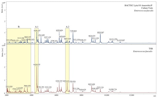 The obtained mass spectra were also analysed for every tested bacteria. Below is a comparison of spectra under specific conditions for exemplary bacterial species. The spectra obtained for bacteria isolated from two different media slightly differ from each other. Some of the signals for the TSB medium vary in intensity (Figure 3(A.1,A.2)). Additionally, due to using the BACTEC Lytic/10 Anaerobic/F Vial Culture Media, a more significant number of signals were obtained (Figure 3B).