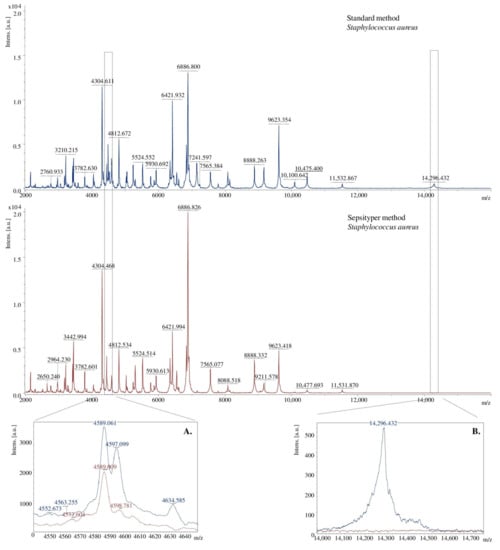 Using two methods of preparing bacterial extracts, spectra of different quality were obtained. The signals received for samples prepared with the Sepsityper method had a higher intensity than those equipped with the standard method. On the other hand, the second method allowed obtaining more separated signals (Figure 4A) and more of them (Figure 4B). The differences may result from the different buffer composition of the analysed sample.
