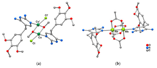 Molecular structure of Cu(II) and Rh(II) complexes with antibiotic trimethoprim molecule: (a) from [15]; (b) from [16]. (H atoms omitted for clarity).