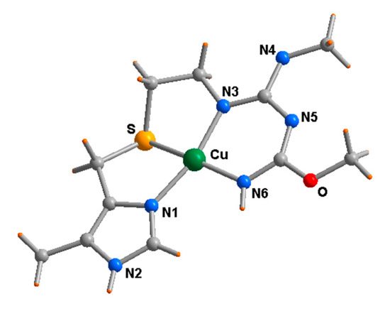 These studies were extended to the interaction of histamine (H2)-receptor antagonists, namely the anti-ulcerative drugs cimetidine, famotidine, and ranitidine, with platinum and palladium [20], studied by 1H-NMR and potentiometric titration, but also with copper [21], of which the structural study indicates the tetradentate ligand wrapped around the almost square planar metal center (Figure 2).