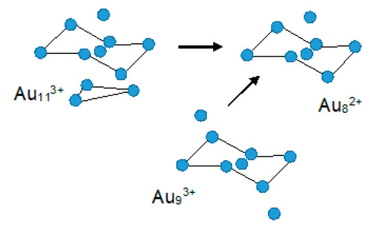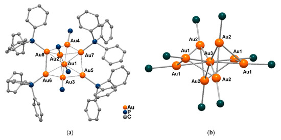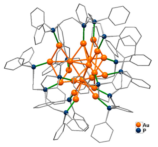 The accurate structure of the [Au9(PPh3)8]3+ cluster exhibits a crystallographic D2 and approximate molecular D2h skeletal symmetry derived from an icosahedron (Figure 4). The compound has been extensively studied, as the reasons for research being carried out on this specific cluster are the availability and low cost of PPh3 along with the ease of cluster synthesis. In fact, this species, deposited and activated on TiO2 and SiO2, has been explored in catalytic reactions [29] and can undergo transformations to form additional clusters.