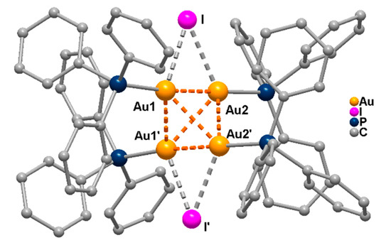 [Au9(PPh3)8]3+ was also reacted with KI in acetone to give [Au4(PPh3)4(µ-I)2], the first tetranuclear gold structure to be reported. The molecular structure shown in Figure 5 presents a crystallographic C2 symmetry with two edge bridging iodine ligands at opposite edges of the metal tetrahedron [32].