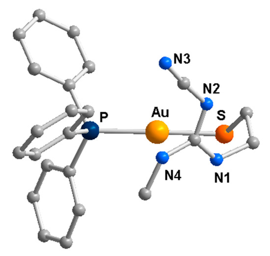 A study in solution was also conducted on (PPh3)Au(C≡CPh) complexes by NMR, indicating that contrary to the solid state findings [33], the existence of Au…Au contacts in solution can be excluded, being solvation effects likely stronger than intermolecular gold contacts [34]. In another experiment, the reaction of (PPh3)AuCl with cimetidine in an alkaline medium under mild conditions led to a complex (Figure 6), comprising a thiolato ligand resulting from cleavage of one of the thioether bonds of cimetidine [35], thus demonstrating a different behavior by the heavier gold atom with respect to copper (see above).