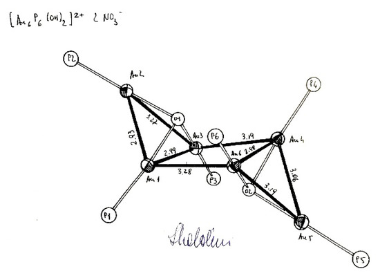 The [(PPh3)6Au6(OH)2]2+ cluster, (Figure 7), synthesized by Naldini was reported in her student’s thesis [12], but single crystals were of poor quality for suitable X-ray structural analysis. However, it was observed that: (i) all the Au…Au distances were within the same order of magnitude; (ii) a prolonged reaction at higher temperature (>50 °C) led to a dark orange-red solution, characteristic of polynuclear gold clusters, indicating the possible partial reduction of gold to Au(0), the number of coupling being determined by kinetics factors.