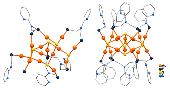 [Au18S8(bdppmapy)6]2+ (left) and [Au14S6(bdppmapy)5]2+ (right) cations (bdppmapy = N,N-bis-(diphenylphosphanylmethyl)-2-aminopyridine, phenyl rings bound to P atoms not shown for clarity) [84].