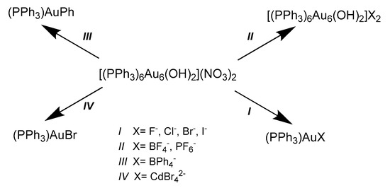With this in mind, the presence of two Au(0) atoms out of six was postulated, with the presence of two OH- anions replacing the oxo groups indicated by other research groups [36,40], since the energy gain due to the two s1 electrons should compensate for the repulsion of ions of the same charge. Numerous exchange reactions were performed in order to obtain crystals of good quality, and the derivatives with NO3- and BF4- counterions were structurally characterized by single crystal X-ray diffraction analysis. However, in some cases, the nucleophilic anions led to the correspondent mononuclear (PPh3)AuX complex (Scheme 2). The organometallic complex (PPh3)AuPh, obtained by extraction of phenyl group from the B(Ph)4- anion, was structurally characterized by X-ray diffraction by Hong et al. [41].