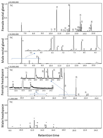 Chromatograms of rectal gland and headspace samples of B. kraussi females and males. Numbers represent compound number in Table 1; * indicates impurities identified by comparing with control samples or solvent runs.