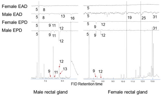 Simultaneous response of flame ionisation detector (FID) and electroantennographic detection (EAD)/electropalpographic detection (EPD) of Bactrocera kraussi male and female antenna and maxillary palps to rectal gland extract from conspecifics. Numbered peaks indicate electrophysiologically active compounds. (E,E)-2,8-dimethyl-1,7-dioxaspiro[5.5]undecane (5), 2-methyl-6-pentyl-3,4-dihydro-2H-pyran (8), (E,Z)/(Z,E)-2,8-dimethyl-1,7-dioxaspiro[5.5]undecane (9), 2-ethyl-7-methyl-1,6-dioxaspiro[4.5]decane isomer 2 (11), (Z,Z)-2,8-dimethyl-1,7-dioxaspiro[5.5]undecane (12), 6-hexyl-2-methyl-3,4-dihydro-2H-pyran (13), 6-oxononan-1-ol (16), ethyl dodecanoate (19), ethyl tetradecanoate (25), ethyl (Z)-hexadec-9-enoate (31).