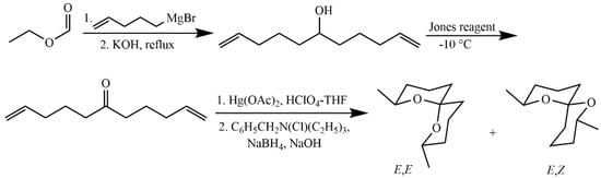 - Baker, R.; Herbert, R.H. Isolation and synthesis of 1,7-dioxaspiro[5.5]undecane and 1,7-dioxaspiro[5.5]undecan-3-and -4-ols from the olive fly (Dacus oleae). J. Chem. Soc. Perkin Trans. 1987, 1, 1123–1127. [Google Scholar] [CrossRef]