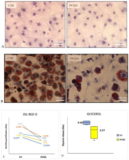 To explore whether DCQA can also affect lipolysis, glycerol release in the culture medium was measured. At PID 9, 3T3-L1 adipocytes were cultured for 24 h in a medium without FBS, and after that time, the supernatant was collected. Figure 2D depicts a significant reduction of glycerol release in the culture medium from 10 µM DCQA-treated 3T3-L1 adipocytes in comparison with control cells after normalization to cell number (mean value ± S.D.: CTR sample, 0.38 ± 0.02 vs. DCQA-treated sample, 0.27 ± 0.08; p < 0.05). The data suggest that DCQA, which decreased the total amount of lipids stored in the adipocytes, can also reduce lipolysis.